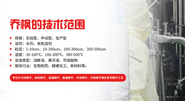 上海喬楓實業(yè)有限公司,成立于2012年,是從事噴霧干燥設備的研發(fā)設計、生產、銷售(小型噴霧干燥機,實驗型噴霧干燥機,35℃低溫噴霧干燥機,有機溶劑噴霧干燥機,低溫閉式循環(huán)噴霧干燥機、超細粉末噴霧干燥機、噴霧冷凍干燥機、真空噴霧干燥機、氣流噴霧干燥機,噴霧造粒干燥機,離心噴霧干燥機,沸騰制粒機等)和售后于一體的綜合性公司,本公司現成為一家致力于為生物制藥、精細化工、新能源、陶瓷造粒及食品工程等領域提供全套解決方案的整線交鑰匙工程企業(yè)。